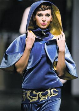 عارضة ترتدي زياً من تصميم بيت جادو للتصميم خلال أسبوع الموضة في كازاخستان أول من أمس.