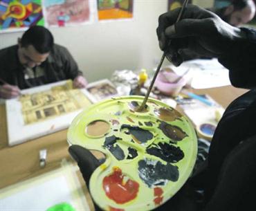 مساجين يرسمون في ورشة عمل في مركز الموقر للإصلاح وإعادة التأهيل، بالقرب من العاصمة الأردنية عمان، الأسبوع الماضي، وهو المركز المؤسس حديثاً، ويوفر خدمات إبداعية وتثقيفية متميزة للمساجين، وتعرض أعمالهم في معارض خاصة في المركز الثقافي الملكي في عمان.