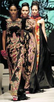عارضات يقدمن مجموعة من الابتكارات لمصممين إندونيسيين وهنود، خلال «أسبوع جاكرتا للموضة 2009» أول من أمس، في خيمة الأزياء في «باسيفيك بالاس» في العاصمة الإندونيسية جاكرتا.