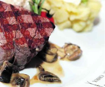 لاستكمال تحضير الصلصة، تضاف الكريمة المطهية مع الاحتفاظ بالمزيج النهائي ساخناً، تتبل شرائح الستيك الأربع (200 غرام لكل شريحة) بالملح والفلفل وزيت الزيتون.