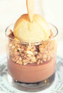 يضاف البسكويت المقرمش فوق موس الشوكولاتة المجمدة، ويمكن إضافة كرة واحدة من آيس كريم الفانيلا، أو القهوة فوق الخليط.