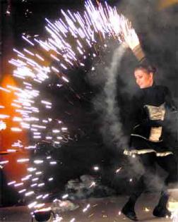 وتقام العروض على مسرح أُعد خصيصاً في آخر البحيرة في القرية العالمية، وتشتمل على حركات مميزة، من خلال استخدامات متعددة للّهب، عبر نفثه أو إدخال النار داخل الفم، أو القيام بألعاب بهلوانية باستخدام النار أو الألعاب النارية الرائعة. ويستخدم العارضون النار والموسيقى والحركات الاستعراضية الإيحائية المعبرة عن الحكايا والقصص، مدعومة بتكنولوجيا متقدمة.