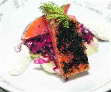 توضع سلطة البطاطس في الصحن، وتضاف إليها كريمة الطهي والخس الأحمر مع صلصة الليمون، وينتهي الطبق بإضافة شريحتين من السملون فوق مزيج السلطة.