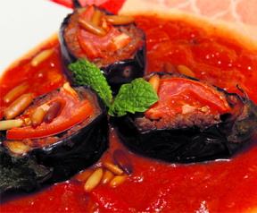 4- تقطّع حبات الباذنجان إلى أنصاف، ويُقلى قلياً عميقاً حتى ينضج ثم يحشى باللحم المفروم المطهو مسبقاً.