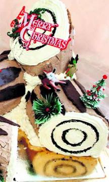 يفك الكعك الذي سبق لفه بورق الحلويات، ثم توضع الكريمة المعدة داخله، ويلف مجدداً، ويغلف بكريمة الشوكولاتة المعدة، ويرش عليه القليل من السكر الناعم، ليوحي بمظهر الثلج.