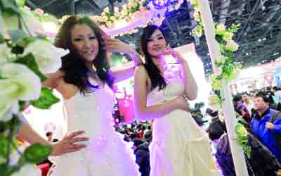 فتيات صينيات يرتدين فساتين في معرض الزفاف الصيني الذي أقيم في بكين أمس. وحسب الإعلام الصيني فإن الإقبال على الزواج قد ارتفع في السنتين الأخيرتين، على الرغم من الأزمة الاقتصادية، وتم تسجيل 10 ملايين متقدم للزواج. وبلغت قيمة «صناعة الأعراس» خلال العام الماضي نحو 65 مليون يورو.