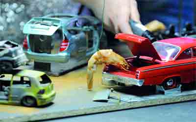 فنانون هولنديون من «شركة الفندق الحديث» يعدون بروفة تجريبية لعرض «حكاية الروبيان» الذي سيقدم في فرنسا ضمن مجموعة عروض استعراضية طريفة.