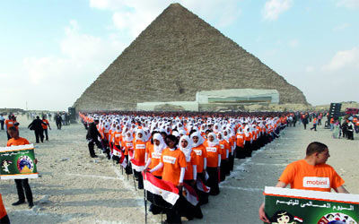 سجل نحو 5000 طفل مصري يوم الجمعة رقماً قياسياً لبلادهم في موسوعة غينيس العالمية للأرقام القياسية، حيث وقفوا في ساحة منطقة الأهرام الأثرية حاملين العلم الوطني في وقفة رمزية وجهوا فيها نداء الى المجتمع الدولي باعتبار يوم اليتيم العربي يوماً عالمياً. وقال المجلس الأعلى للآثار منظم الوقفة في بيان إن «4450 طفلاً مصرياً استطاعوا تحطيم الرقم القياسي السابق ودخول موسوعة الأرقام القياسية العالمية غينيس». وأشاد المحكم الدولي لموسوعة الأرقام القياسية الذي حضر خصوصاً من بريطانيا ليشهد هذا الحدث بالتحضيرات الكبيرة، مؤكداً أن هذا الرقم المصري الجديد تفوق وحطم الرقم البلجيكي السابق وهو 760 طفلاً ملوحين بالأعلام. وقالت مديرة التنمية الثقافية بالمجلس الأعلى للآثار انجي فايد، إن «الوقفة التي تنظم بمشاركة دار الأورمان لرعاية الأيتام في القاهرة وهي منظمة خيرية أهلية تهدف الى تشجيع العمل المجتمعي والدعوة لزيادة الوعي الاثري، اضافة الى اعتبار يوم اليتيم العربي يوماً عالمياً، وحث المجتمع الدولي على دعم ومساندة الأطفال الأيتام في العالم العربي». ولا تُتاح في مصر أرقام تقريبية عن عدد الأطفال الايتام من المصريين أو العرب، وما إذا كانت نسبتهم أعلى من مناطق أخرى في العالم تخلو من الحروب أو الكوارث الطبيعية
