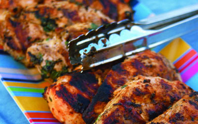 أربع قطع من صدور الدجاج منزوعة الجلد مقطعة إلى أنصاف.