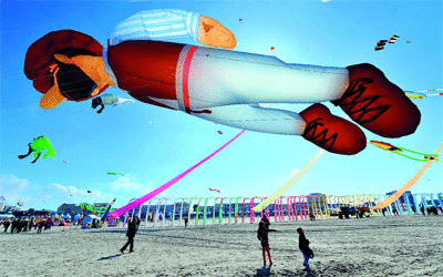 متنافسون يطيرون نماذج ورقية مختلفة، خلال المهرجان الدولي للطائرات الورقية، الذي ينظم في شمال فرنسا حتى 18 من الشهر الجاري.