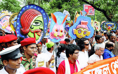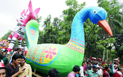 مجموعة من الأفراد، من بنغلاديش، يحضرون أول أيام السنة البنغالية الجديدة في مدينة داكا، حيث يحتفل الأفراد في هذا اليوم في مسيرات ملونة وبرامج ورقصات وموسيقى تقليدية.