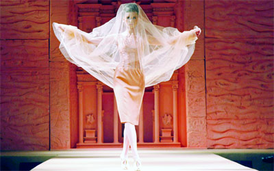 عارضات يقدمن مجموعة من الابتكارات للمصمم الإيطالي الفلسطيني الأصل جمال تصلق، خلال عرض أزياء أقيم بهدف جمع التبرعات الخيرية للجمعيات المحلية في العاصمة الأردنية عمان.