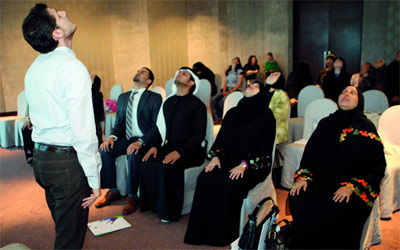 وقدم مدرب اليوغا جورج اسطنبولي، مفاهيم اليوغا على الكرسي، والتي يمكن أن يقوم بها المرء وهو جالس في مكتبه، أو في منزله، للتخفيف من الضرر الناتج عن التوتر، والذي قد يقود للروماتيزم أو عدم انتظام دقات القلب، أو حتى السرطان، معتبرا ان الضغوط باتت من أكثر الأمراض خطرا في العالم. وأشار إلى أنه من الضروري أن يعرف المرء كيف يحدث التوتر ليتمكن من إيقافه، وقال «يتعرف العقل إلى وجود الخطر في الحياة اليومية، ثم يقوم الجسم بإفراز الأدرينالين والكورتيزون وهرمونات التوتر والسكر والكوليسترول، وبالتالي يتصرف الانسان بشكل حضاري يكبتها داخل الجسم، الأمر الذي يؤدي الى بروز الأمراض».