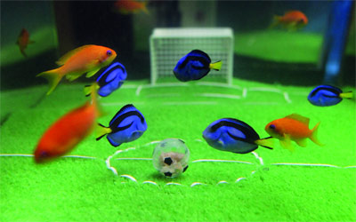 أسماك ملونة بالأزرق تمثل المنتخب الياباني، وأخرى ملونة بالبرتقالي تمثل هولندا، تسبح في حوض ماء يمثل ملعب كرة قدم في الحديقة المائية «جنة هاكاجيما البحرية» في يوكوهاما في اليابان، أمس، حيث ستلعب اليابان ضد هولندا خلال كأس العالم المقبلة في جنوب إفريقيا.
