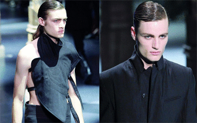 عارضون يقدمون مجموعة من ابتكارات المصممة البلجيكية آن ديميولميستر، خلال أسبوع الأزياء الرجالية لربيع وصيف 2011 للملابس الجاهزة في العاصمة الفرنسية باريس، معتمدة اللون الأسود عنصراً غالباً على مجموعتها ذات الخطوط الغامضة.