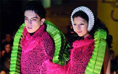 عارضات يقدمن ابتكارات ورقية ومواد معادة التدوير للمصمم البوليفي ماريون ماكيدو، خلال عرض أزياء في مدينة لاباز يوم الجمعة الماضي.