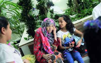 وتوجه 26 طفلاً من أعضاء النادي من الفتيان والفتيات إلى استراحة الشواب، برفقة مجموعة من المشرفين، والتقوا بالشواب كبار السن من الرجال والنساء، وتبادلوا معهم أطراف الحديث وسط جو من الود والمحبة.