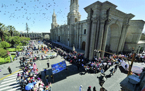 راقصون وسكان يرتدون الملابس التقليدية القديمة، يحتفلون في مدينة أريكويبا جنوب البيرو، خلال الفعاليات الشهرية بمناسبة إنشاء المدينة، والتي أنشأها الإسبان في ،1540 وهي ثاني أشهر مدينة في البيرو بمليون نسمة قابعة على مرتفعات الأنديز بارتفاع يصل إلى 2380 متراً فوق السطح.