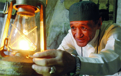 المسحراتي اللبناني محمد فناص، يقوم بعمله الليلي اليومي بإيقاظ النائمين استعداداً للسحور قبل طلوع الفجر وبدء صيام جديد، في المدينة القديمة في الميناء الجنوبي في مدينة صيدا اللبنانية أول من أمس.