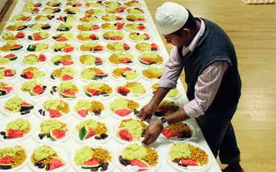 مسلمون يجهزون وجبات إفطار لمئات الصائمين، في أحد المراكز الإسلامية في العاصمة البريطانية لندن، حيث يؤم المركز الكثير من المسلمين المقيمين في إنجلترا.