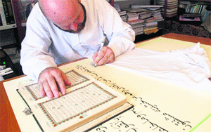 اللبناني الشيخ حسين زيات يقلب في صفحات المصحف الشريف الذي قام بكتابته بأقلام الخط العربي مستهلكا 500 قلم خط عربي، في محاولة لخط المصحف، وتسجيله في موسوعة غينيس للأرقام القياسية، يعمل الشيخ زيات على نسخ القرآن في منزله في طير دبا في جنوب لبنان.
