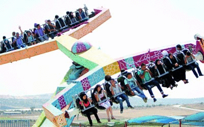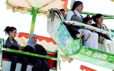 في أجواء من البهجة، فلسطينيون يستمتعون بعيد الفطر السعيد، في ملاهٍ بمدينة جنين في فلسطين.
