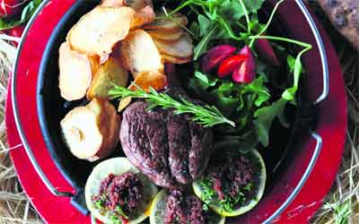 3- يقدم الستيك مع البطاطس المتبلة بالملح والفلفل الأسود والقليل من الطماطم المجففة وإكليل الجبل المجفف، إضافة إلى القليل من أوراق الخس المزينة لجانب الطبق مع أي نوع مفضل من الصلصة المنزلية.