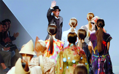 عارضات يقدمن عدداً من ابتكارات المصمم الياباني داي فوجيوارا في مجموعته لربيع وصيف ،2011 خلال عرض نظم، أول من أمس، في العاصمة الفرنسية باريس.