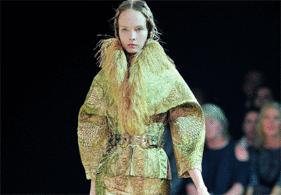 عارضات يقدّمن آخر مجموعات دار الأزياء البريطانية «ألكساندر ماكوين» المرتكزة على الخيوط المذهبة المحبوكة، لربيع وصيف 2011 للملابس الجاهزة خلال أسبوع باريس للموضة الأسبوع الماضي، والتي صممتها البريطانية سارة برتون، بعد انتحار المصمم الشهير في فبراير من العام الجاري عن عمر ناهز 40 عاماً.