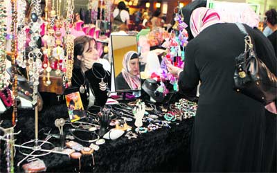 وتميز المعرض بكثرة الإكسسوارات، لاسيما التي تستخدم فيها الأحجار نصف الثمينة، الى جانب التحف المنزلية، وكذلك الرسوم على الزجاج والحرير، الى جانب الاطعمة، ومنها حلويات الاطفال والأطعمة.