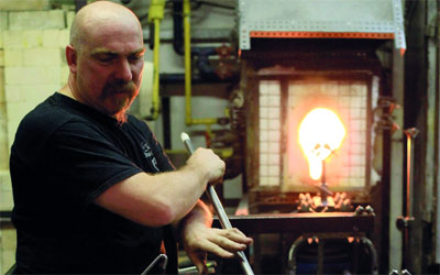صانع الزجاج ويل شكسبير، يعد كرات زجاجية في ورشته «زجاج وغاليري شكسبير»، أول من أمس، في مدينة توانتون في إنجلترا، إذ يجهز أكثر من 100 كرة زجاجية في اليوم الواحد استعداداً لتلبية الطلبات المتزايدة على الكرات الزجاجية الملونة المزينة لأشجار الكريسماس.