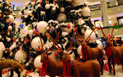 شجرة «الكريسماس» المزينة بأقواس وأضواء الأعياد، وبعربة تزلج بابا نويل التي تغطيها الثلوج الساحرة، ورجل الثلج التقليدي، وغزلان الرنة وأقزام العيد مع المرنمين.. معالم مبهجة تستقبل زائري مركز الواحة للتسوق في دبي.