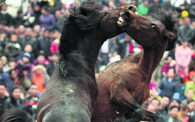 خيول تتقاتل خلال مسابقة صينية تقليدية الأسبوع الماضي، بمقاطعة كوانغي في الصين، وشارك في المسابقة أكثر من 30 فرساً من مختلف المقاطعات في هذا النشاط التقليدي، خلال الاحتفاء بمهرجان الأضواء.