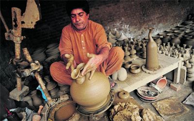 صانعا جرار طينية يعملان في مصنع في شرق مدينة غوجرات البنغابية في باكستان الأسبوع الماضي. ويقوم العمال بإعداد الطين استعدادا لتكوين أشكال وزخرفات يدوية منه، حيث يعيش نحو 167 مليون باكستاني من مجموعة 70٪ من الأفراد الذين يعيشون في تلك المناطق الرئيسة يقتاتون على صناعة وبيع الجرار الطينية والتي تعتبر حرفتهم الرئيسة والتقليدية منذ قرون بعيدة.