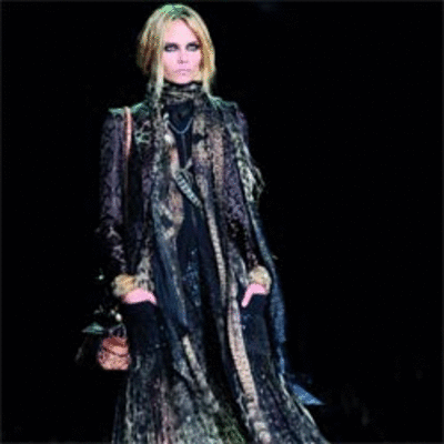 بين الخامات المطبعة بألوانها الداكنة، والتموج الشديد المتزاوج مع طبقات وطبقات من المناديل والاكسسوارات الإثنية، ومعاطف فرو مقطعة، ظهرت امرأة المصمم الإيطالي روبيرتو كفالي، أكثر غموضاً وقوة وتمرداً غجرياً صاخباً. لمسة لا يمكن أن تتحقق إلا بقدرة كفالي على المبالغة، مقدماً مجموعة فخمة، بلمسة متمردة وغامضة، زادتها العيون المكحلة بكثافة تأثيراً، فكانت مجموعته لخريف وشتاء 2011-2012 للملابس الجاهزة، التي قدمها الأسبوع الماضي خلال «أسبوع ميلان للموضة».