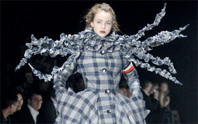 تصاميم ومناديل وأوشحة نافرة كما لو كانت متطايرة تقدمها مجموعة من العارضات، وهي آخر ابتكارات مصمم الأزياء الروسي ييغور زايتزيف، خلال أسبوع مرسيدس بنز للموضة في العاصمة الروسية
