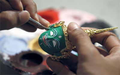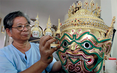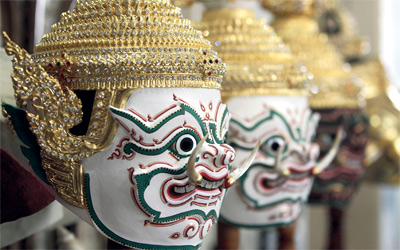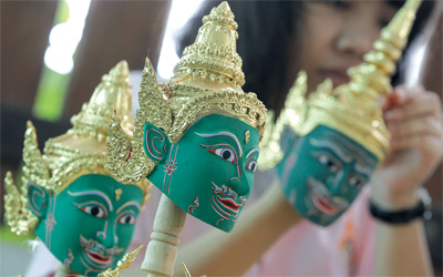فنانون شعبيون تايلانديون خلال مشاركتهم في مهرجان «الأقنعة السنوي»، الذي يتبارى فيه عدد من أبرز الحرفيين في تصميم الأقنعه والملابس التقليدية، التي ترمز إلى حكايا شهيرة ومؤثرة في الثقافة التايلاندية.