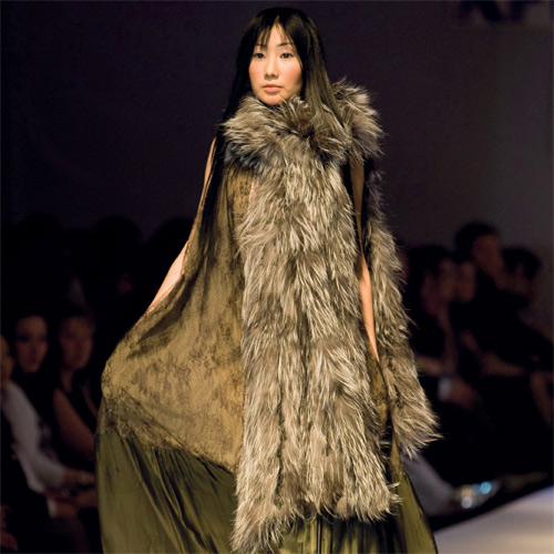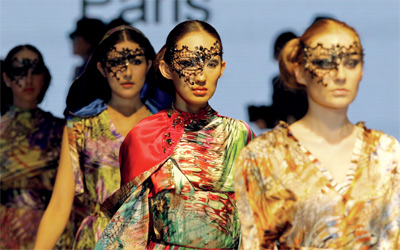 عارضات يرتدين ملابس من تصاميم مشاركة في «أسبوع الأزياء» في مدينة ألماتي عاصمة كازاخستان، أول من أمس.