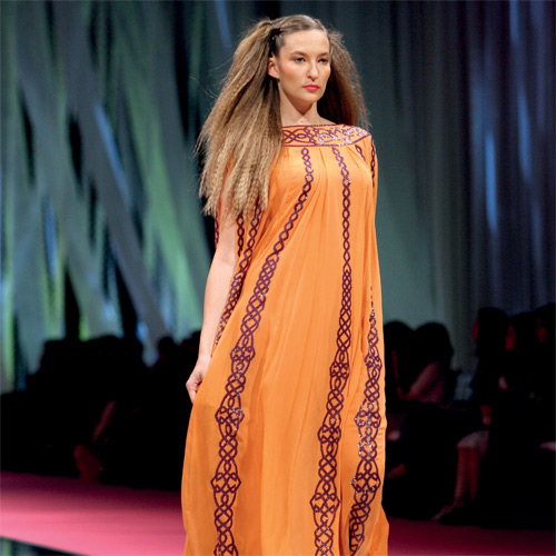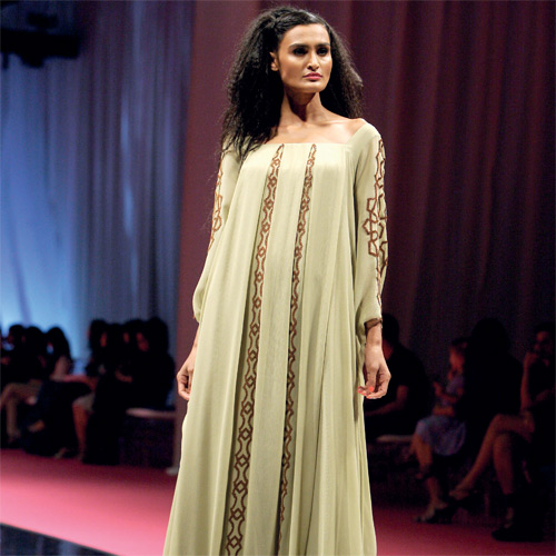 كانت النقوش الإسلامية التي زينت فساتين وجلابيات العارضات، واحدة من أكثر التصاميم جاذبية خلال المجموعة، خصوصاً التي اعتمدت النقوش السوداء، إضافة إلى التي اعتمدت الألوان الفسفورية الفاقعة بدرجة غير لماعة، تباينت بقوة لونها والخامات التي تحتضنها، إذ تزينت الخامات بنقوش إسلامية هندسية تكونت كالخطوط أو الشرائط المتوازية المستقيمة، التي اعتمدتها المصممة في غالبية المجموعة، بين المزينة للتنانير الفساتين، أو التي تبدأ من الصدر لتنسدل متداخلة بين الخامات المتموجة، أو التي تتربع على أكتاف العباءات والقفطانات الشيفونية، معتمدة في تنفيذها نوعا شديد الدقة والصغر من الترتر اللماع، والمطفي من مختلف الألوان، وتحديداً الأسود بلمعته الدقيقة، التي نفذت يدوياً، وأخذت في تنفيذها وإضافتها على شكل تلك النقوش الإسلامية فوق الشيفونات ما يفوق على 400 ساعة، بحسب المصممة، إذ تناثرت تلك الشذرات الدقيقة من الترتر مكونة نقوشاً ورسومات إسلامية تكثفت تارة في بداية تنانير الفساتين أو حواشيها، بينما خرجت منها تارة أخرى خطوط هندسية توزعت على طول القصات المقسمة للتنانير، بألوان ولمعات مختلفة ومتنوعة، تزينت جميعها بتلك الفكرة المبتكرة للترتر.