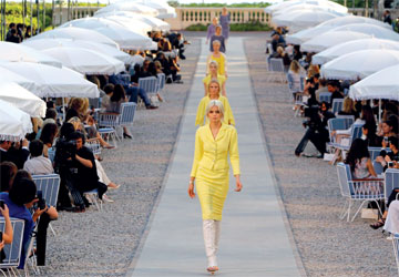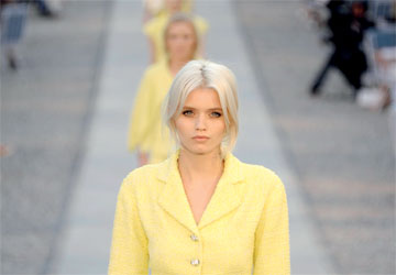 عارضات يقدمن آخر ابتكارات مصمم الأزياء الألماني كارل لاغرفيلد، لدار الأزياء الفرنسية «شانيل» لمجموعة «الكروز 2011-2012»، الاثنين الماضي، بالقرب من مدينة كان الفرنسية، وذلك قبيل انطلاق مهرجان كان السينمائي في دورته الـ،64 وقد تلا عرض الأزياء عرض لفيلم «حكاية جنية» الذي أخرجه المصمم لاغرفيلد.