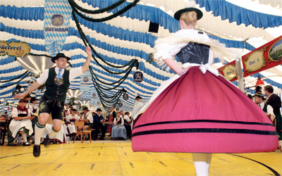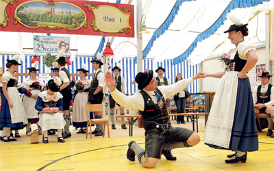 مجموعة من الفتيات والشباب والأطفال يرتدون الملابس التقليدية البافارية، الخاصة بتلك المنطقة، إذ يجتمعون لتقديم عروض الرقص التقليدي «شابلاتلر» خلال مسابقة «جائزة الأسد البافارية» السبت الماضي، في مدينة ويلهلم في ألمانيا، وتعتمد هذه الرقصة على كثير من الحركات الحماسية من فقز وتصفيق باليدين، والتصفيق على الركبة وباطن القدم، بينما تغلب الحركات الدائرية الملتفة على رقصة الفتاة، وهي واحدة من الرقصات التقليدية المشهورة في هذه المنطقة، التي استقرت فيها «هيوسي»، وهي واحدة من أعرق القبائل البافارية التي سادت المنطقة في القرن السابع.