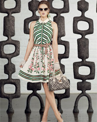 مع مثل هذه المجموعة، لا يمكن منافسة تسريحة ذيل الفرس الأنيقة المزينة برباط حريري، مع إكسسوارات ذات موضة فرنسية كلاسيكية خمسينية، لإضفاء ذلك الرونق على الأناقة الناعمة، إذ تعتمد التشكيلة ألواناً من التطريز الفيروزي والقرنفلي الداكن والأزهار المصنوعة يدوياً من ألياف الرافية والجلد، ونظراً لأن حقيبة اليد مصنوعة من جلد التمساح، فهي تضفي لمسة من السحر والجاذبية على المظهر العام، علاوة على الحقائب المعدنية المزينة باللآلئ، متوافرة بدرجات مختلفة، بينما تتزين الأحذية بالنقوش الزهرية الجذابة، دون نسيان الأحذية الرياضية والصنادل، وذات الكعب العالي بقاعدة كاملة كذلك.