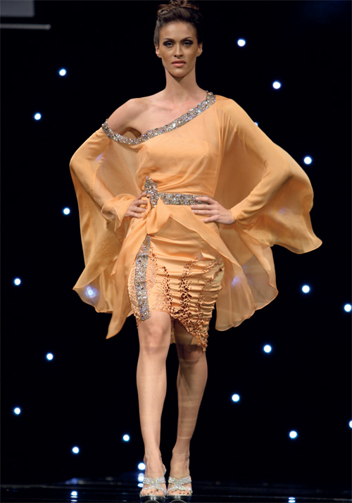 اعتمد المصمم الخامات الفخمة المناسبة للسهرة، من الحرير، والكريب الحريري، والفاي، والدانتيل، والتول، والبروكار، إضافة إلى الشيفون الذي انسدل بتميز بطريقة أقرب إلى الأوشحة القصيرة فوق فساتين ضيقة من اللون نفسه، مزيناً تلك الأوشحة بحدود من الكريستال، والأحجار الناعمة المتفاوتة بين الفضي والذهبي، التي زينت الرقبة المستديرة المتهدلة، ومتجمعة بشكل ضيق على الخصر كحزام كريستالي أنيق، بينما تزينت التنورة الحريرية المخرمة بخط طولي وحيد على طول الساق، وهي الفكرة التي قدمها المصمم أيضاً في فستان آخر بلون أزرق صارخ، الذي اعتمد هو الآخر الحمالة الواحدة، بفستان ضيق تغطيه طبقة شيفونة مخرمة ومزينة في جهة واحدة بالزهور البارزة على طول الفستان.