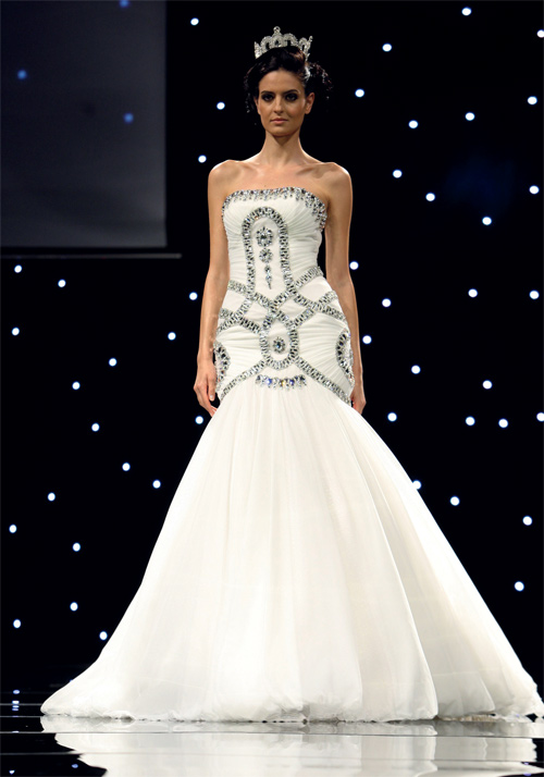 قدم المصمم فستاني زفاف فخمين، تميزا بلونهما العاجي الفخم، معتمداً على فكرة القالب الضيق الواصل حتى الأرداف، وخطوط الزينة والكريستال المتناظرة تارة والمتوازية تارة أخرى، بخلفية من الدانتيل ذات اللمسات الذهبية البسيطة، والتنورة المنتفخة، ذات الطبقات المتعددة والمتفاوتة في أطوالها وحواشيها، التي تزين بعضها باللؤلؤ، وتزين بعضها الآخر بالدانتيل، إضافة إلى فستان تزين بالكريستال الأبيض على قالب اعتمد التجمعات المتفاوتة للقماش، بينما رسم الكريستال خطوطاً متموجة ومستديرة في متاهات متناظرة فوق تنورة منتفخة ناعمة.