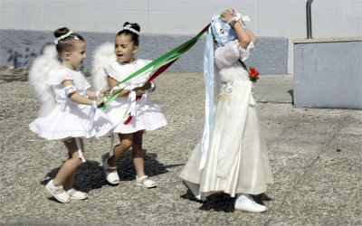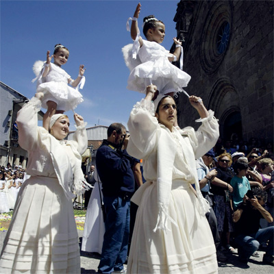 فتيات في الخامسة من العمر يتراقصن على أكتاف أمهاتهن خلال احتفالات «كوكا» في مدينة ريدونديلا شمال شرق إسبانيا الأسبوع الماضي. وتتمثل الرقصة التقليدية على أكتاف الأمهات، في أسطورة، حيث يعتقد سكان المدينة أنها تعود إلى حكاية من العصور الوسطى عن امرأتين استطاعتا النجاة بحياتهما من تنين متوحش، بعد أن قامتا برقصات مماثلة لتلك التي تقوم بها الفتيات الصغيرات. وترتدي الفتيات في هذه الاحتفالات ملابس تقليدية معروفة باسم «بينلاس» تتميز بلونها الأبيض الناصع وطبقاتها المتعددة، كما تحتوي على شريطين جانبيين تقوم الأم بالتمسك بهما خلال وقوف الطفلة على كتفها لتفادي وقوعها.