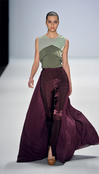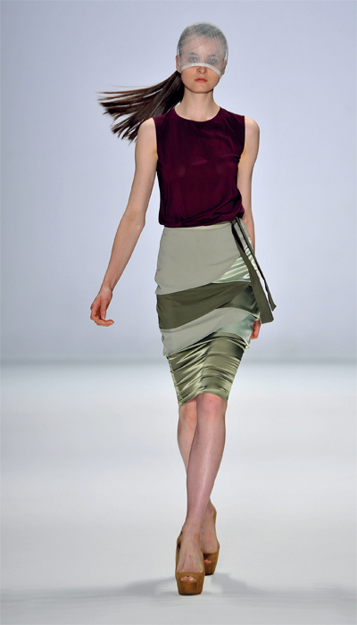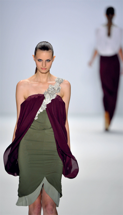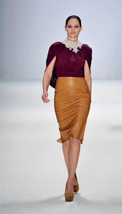 عارضات يقدمن مجموعة من ابتكارات مصمم الأزياء ستيفان بيلغر، خلال أسبوع برلين للموضة، الذي اختتم أخيرا لربيع وصيف ،2012 معتمدا مجموعة من إكسسوارات الوجه والرأس والساق، المطرزة بالكريستال وعدد من الألوان السادة والقصات المتعددة.