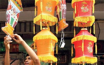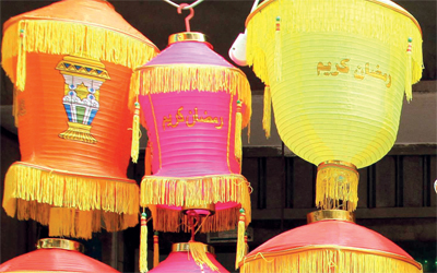 بائع فلسطيني يعرض، أمس، مجموعة من فوانيس رمضان في سوق بمدينة غزة، استعداداً للشهر المبارك.