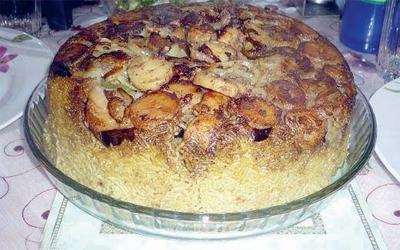 10- بعد أن ينضج الأرز تقلب محتويات القدر على صينية ويزين وجهها بالمكسرات المقلية.