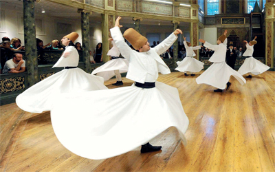 دراويش المولوية يؤدون رقصة في احتفالية بإحدى الصالات الأثرية، في مدينة إسطنبول التركية أول من أمس.