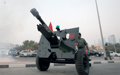 وأضاف «استعداداً لممارسة هذا التقليد سنوياً، يتم تجهيز عدد ستة مدافع، منها أربعة أساسية، واثنان احتياط لاستخدامها في حال تعرض أحد المدافع الرئيسة لعطل، كانت تستخدم سابقاً في استقبال كبار ضيوف الدولة، تم صنعها في بريطانيا بين عامي 1930 و1942»، وتابع «توزع المدافع الأربعة على أربع مناطق، منها اثنان في منطقة ديرة، في مصلى العيد ومنطقة الرأس، والاثنان الآخران في منطقة بر دبي، في مصلى العيد بالكرامة وحديقة الصفا، ويتم تشكيل فريق يتألف من 16 عسكرياً، بواقع أربعة أفراد لكل مدفع حسب الموقع».